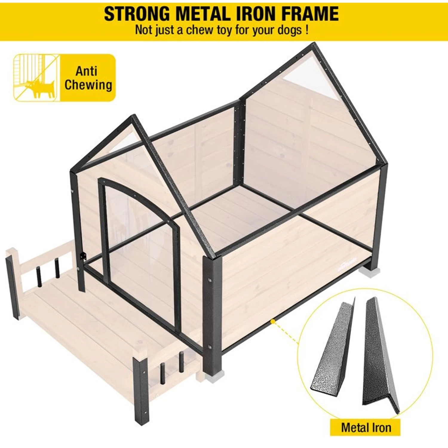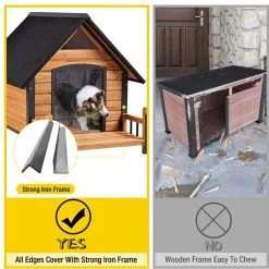 - Designed with an all-around, innovative iron frame, this paw-fect dog house features enhanced construction and resists chewing so it lasts longer, while the waterproof asphalt roof protects your pet pooch from the sun and rain.