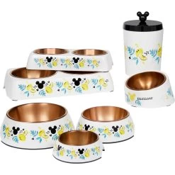 - Disney’s Mickey Mouse pet treat jar comes in white and is covered with Mickey’s face and a bunch of lemons for extra cuteness. Matching food bowls also available.