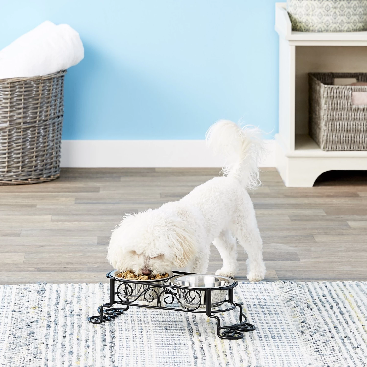 - Elevated pet feeder with hand crafted scroll work design and two stainless steel bowls.