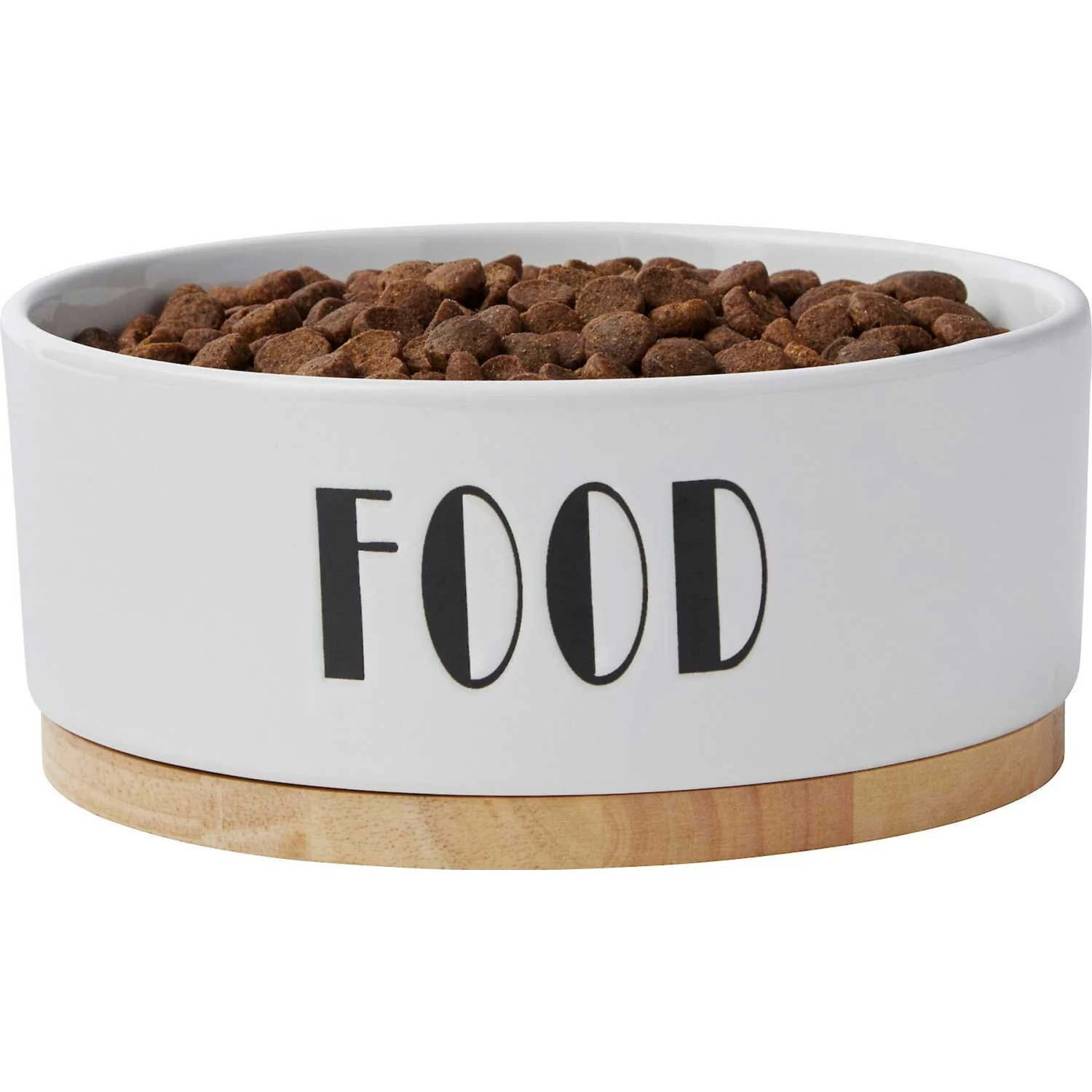 - Simple, white ceramic pet bowl with modern, black “food” graphic on the side.
