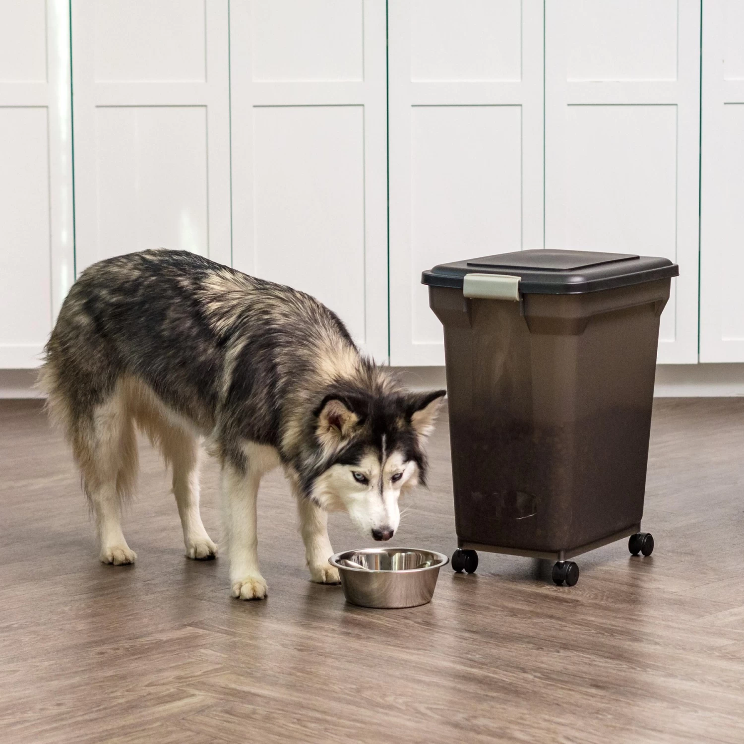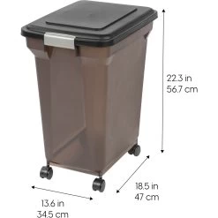 - Store the bin on a shelf, or attach the optional caster wheels to easily roll it from storage to your pet’s food bowl.