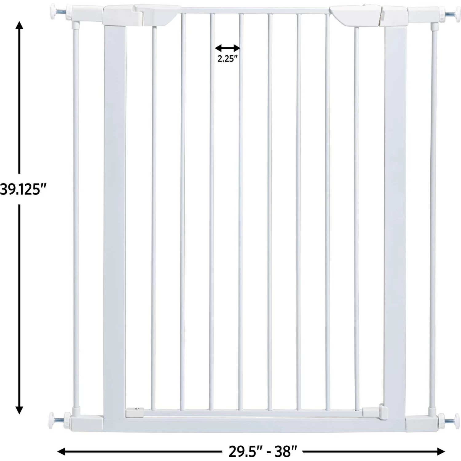 - Pet gate in textured graphite measures expands from 29.5 up to 38 inches wide.