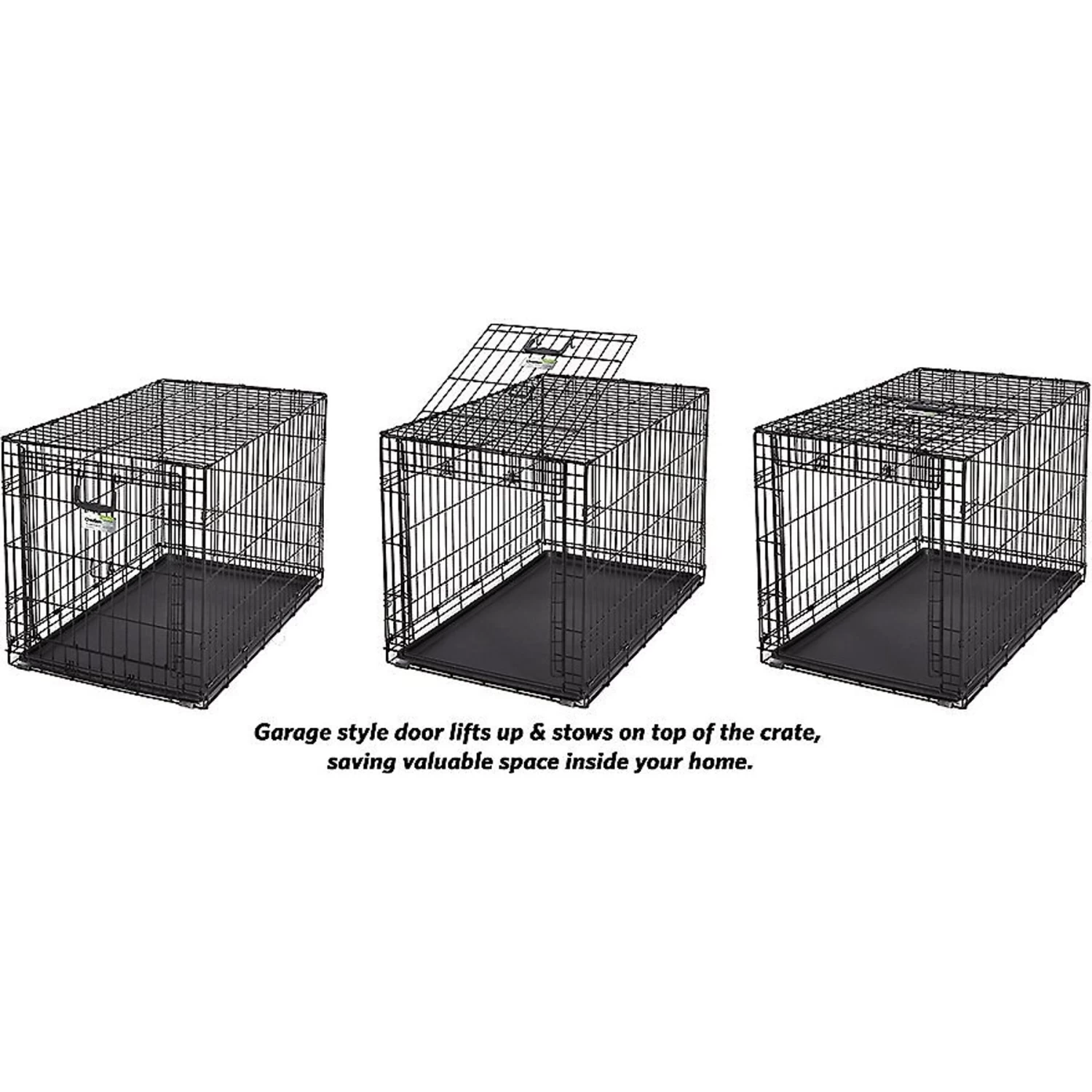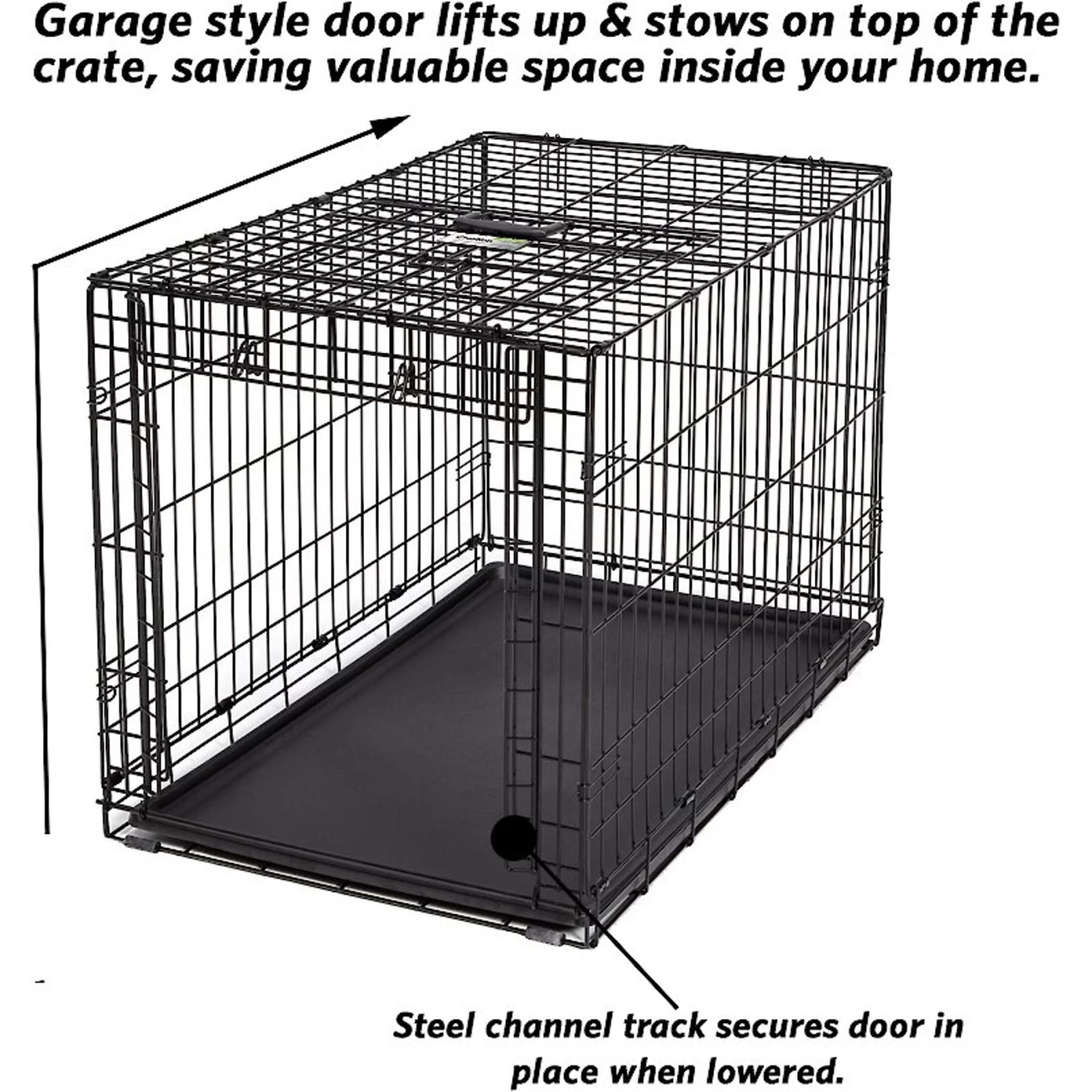 - Convenient, super secure garage style door on dog crate lifts up & stows on top of the crate saving valuable space inside your home.