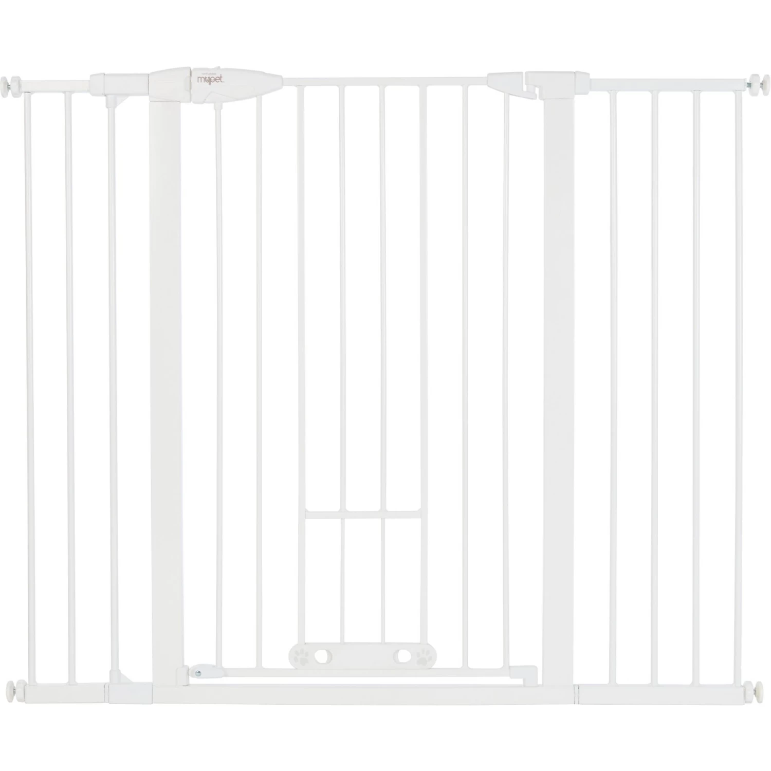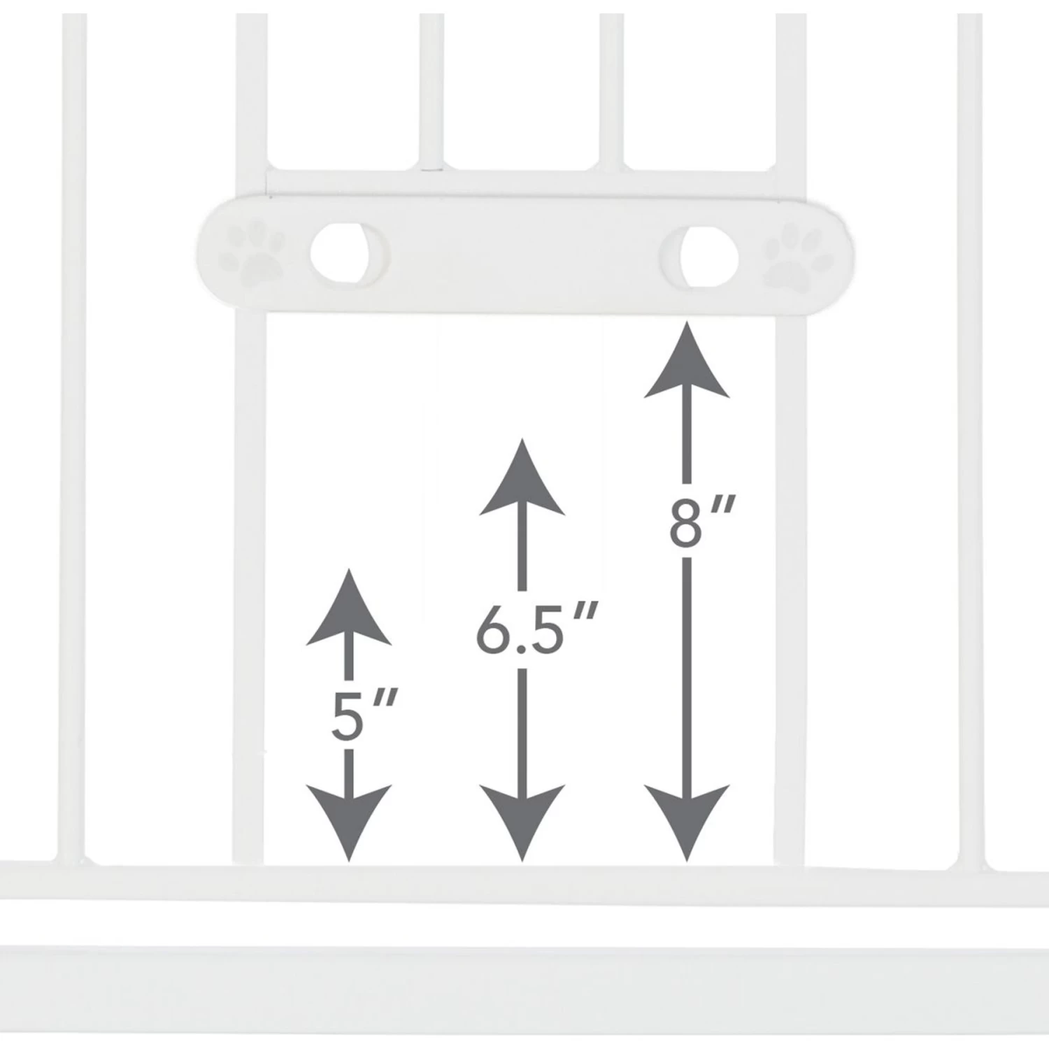 - Small, adjustable pet door retracts into gate tubing and comes with three height settings, allowing smaller dogs and cats the freedom to come and go while larger pets stay contained.