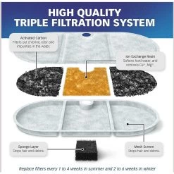 - Pet fountain filter works to effectively remove hair and heavy metals from your pal’s water while keeping it fresh and tasty.