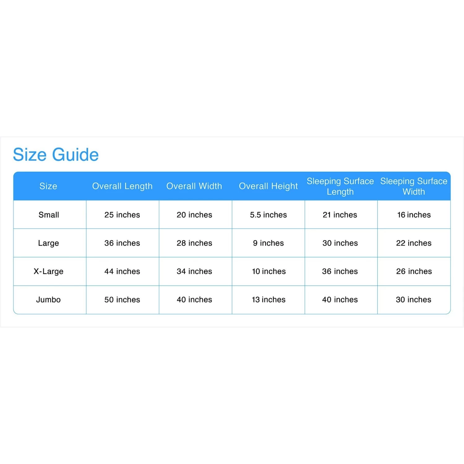 - Each size features a memory foam base with medium firmness for maximum comfort—the small has 2 inches of memory foam, the large and extra-large have 4 inches and the jumbo has 6 inches.
