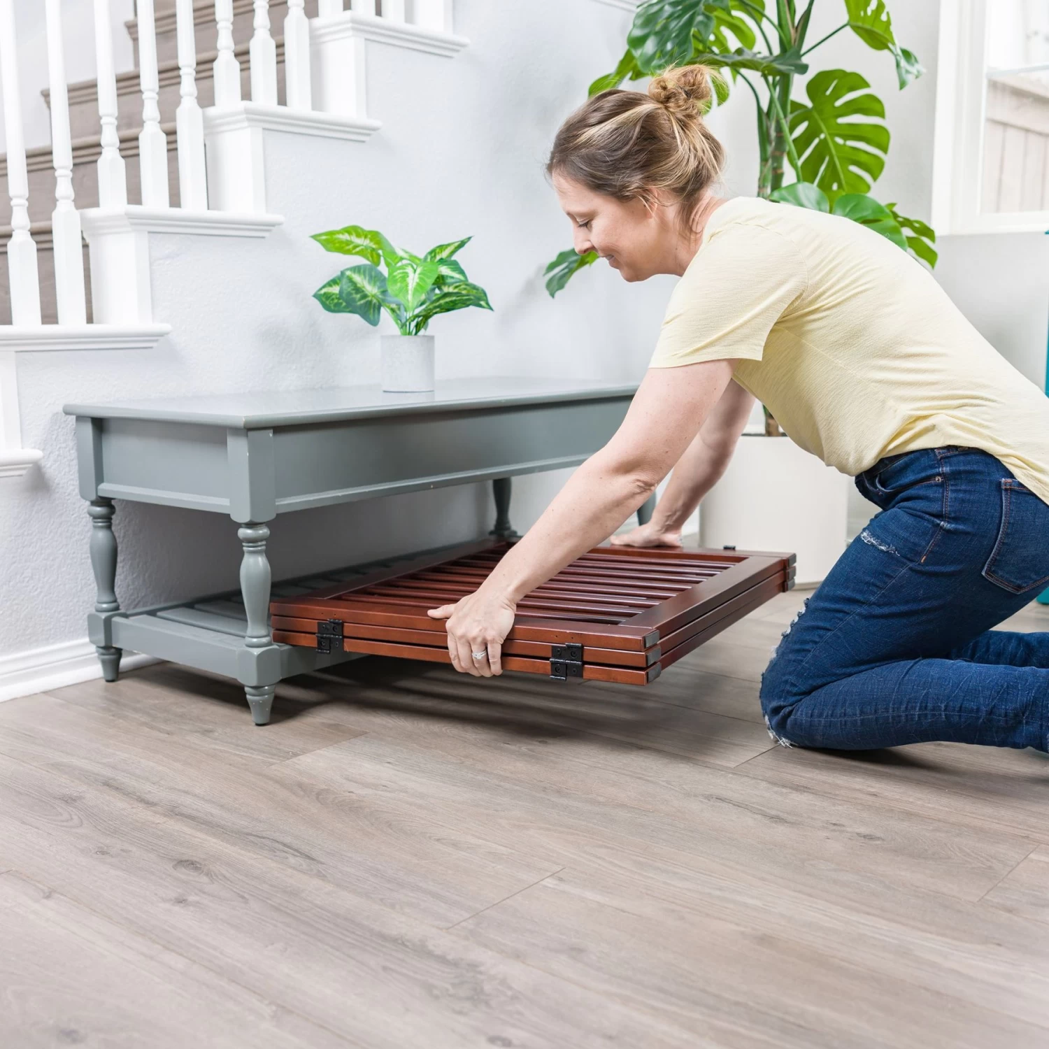 - Rubber pads protect the floor from scratches.