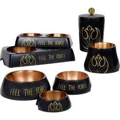 - STAR WARS pet treat jar comes in a black color with the Rebel icon on the front and is part of a series with matching dog and cat food bowls.