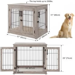- Stylish wooden dog crate with metal wire panels doubles as a side table, end table or nightstand.